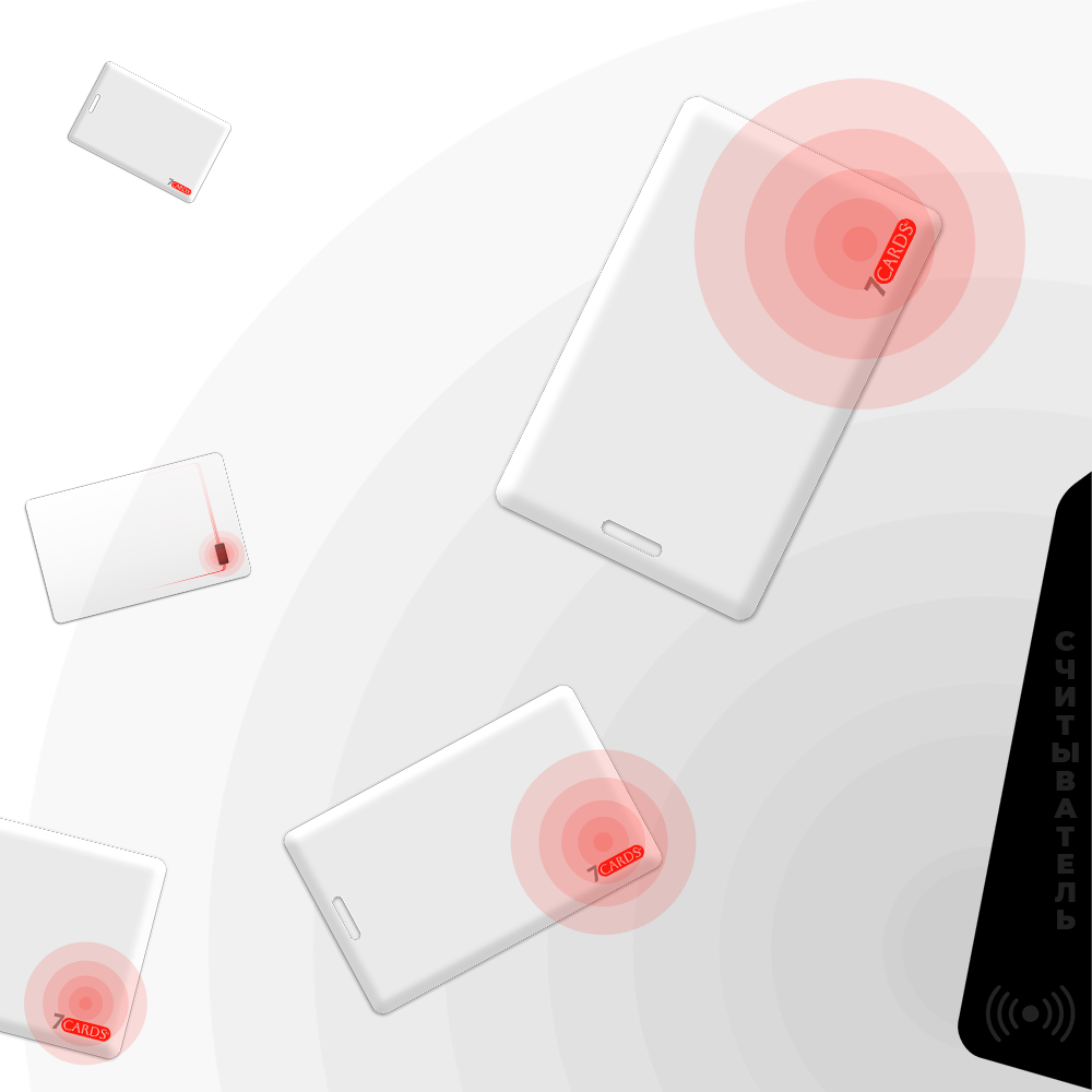 Данные RFID карты используют радиоволны дальнего поля. Считыватель излучает сигнал, который активирует метки в зоне действия. Технология поддерживает массовое чтение (до 1000 меток/сек).
